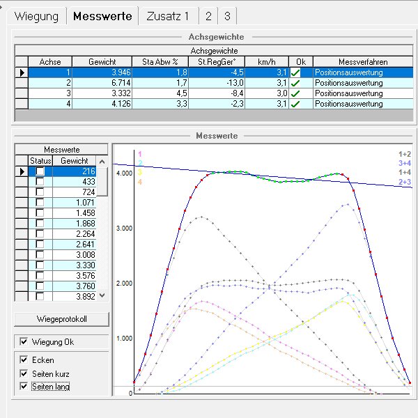 Die erstellten Wiegungen werden in der PC-Software mit allen Details aufgezeichnet. Wiegekurven der einzelnen Achsen werden dargestellt und Daten zur Qualität der Wiegungen berechnet und angezeigt.