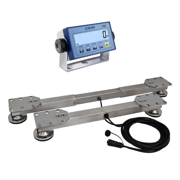 2 Wiegebalken aus Edelstahl • 4.000 kg Wiegebereich • Balkenlänge stufenlos verstellbar zwischen 734 und 1.043 mm Außenlänge • Einfache und schnelle Montage unter alle Arten von Aufbauten durch variable Lochabstände • Montagemaße zwischen 480 und 990 mm stufenlos wählbar • wasserdicht nach Schutzklasse IP68 • 4m lange Anschlusskabel • Ideal für die universelle Verwendung, auch in anspruchsvollen Umgebungen • hochwertige, wasserdichte Wiegeanzeige DFWLB