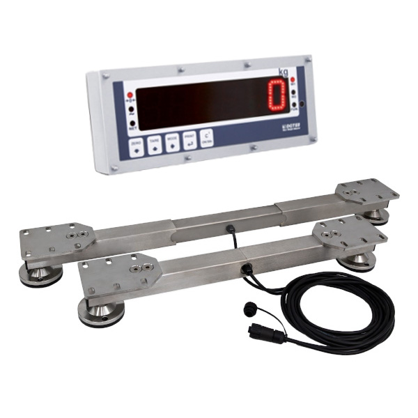 2 Wiegebalken aus Edelstahl • 4.000 kg Wiegebereich, 0,5 kg Auflösung • Balkenlänge stufenlos verstellbar zwischen 734 und 1.043 mm Außenlänge • Einfache und schnelle Montage unter alle Arten von Aufbauten durch variable Lochabstände • Montagemaße zwischen 480 und 990 mm stufenlos wählbar • wasserdicht nach Schutzklasse IP68 • 4m lange Anschlusskabel • Ideal für die universelle Verwendung, auch in anspruchsvollen Umgebungen • große Edelstahl-Wiegeanzeige mit 60 mm hohen Leuchtziffern